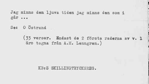 //// Jag minns den ljuva tiden jag minns den som i ! //// går ... //// Se: 0 Östrand . //// i //// (33 verser. Endast de 2 första raderna av v. 1 //// äro tagna från Å.M. Lenngren.) //// ! //// KB:S SKILLINGTRYCKSREG. //// r ////