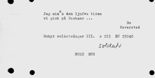 //// --Jag min s den ljufva tiden //// vi gick p& Backamo ... //// Bo //// Naverstad //// Mskpt soldatsånger III. s 215 EU 25040 //// NORD ms ////