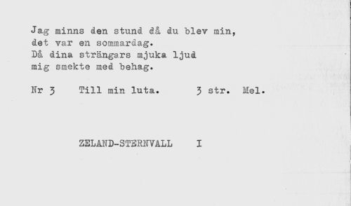 //// Jag minns den stund då du blev min, //// det var en sommardag. //// Då dina strängars mjuka ljud //// mig smekte med behag. //// Nr 3 Till min luta. 3 str. Hel. //// ZELAND-ST3RNVALL I //// < ////