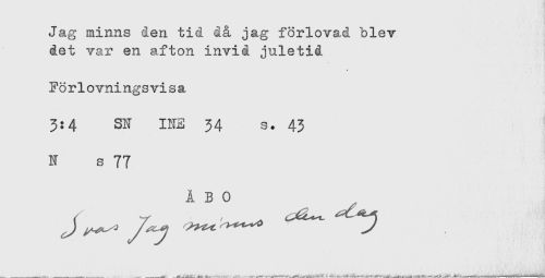 //// Jag minns den tid då jag förlovad blev //// det var en afton invid juletid //// Förlovningsvisa //// 3:4 SN INE 34 s. 43 //// N s 77 //// ÅBO ^ ////