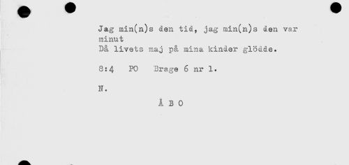 //// Jag min(n)s den tid, jag min(n)s den var //// minut //// Då livets maj på mina kinder glödde. //// 8:4 PO Brage 6 nr 1. //// N. //// ÅBO ////
