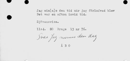 //// Jag min(n)s den tid når jag förlofvad blev //// ^^ Det var en afton invid tid. //// Sjömansvisa. //// 11:4. SO Brage 13 nr 76. //// ÅBO ////