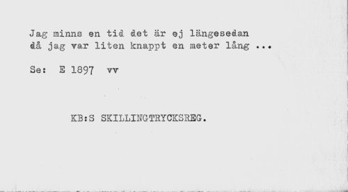 //// Jag minns en tid det år ej längesedan //// då jag var liten knappt en meter lång ... //// Se: E 1897 vv //// « //// * //// t //// KB:S SKILLINGTRYCKSREG. //// - ////