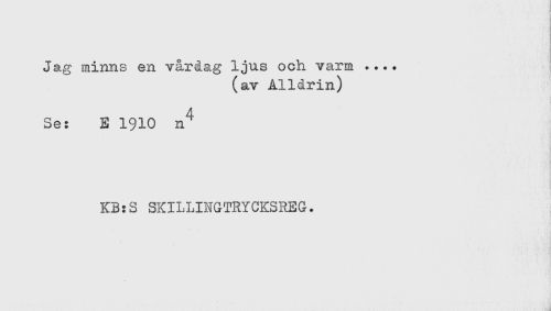 //// Jag minns en vårdag ljus och varm .... //// (av Alldrin) //// Se: E 1910 n^ //// KB:S SKILLINGTRYCKSREG. ////