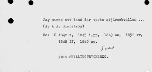 //// Jag minns ett land där tysta stjärnekvällen ... //// (Av A.A. Grafström) //// Se: E 1842 z, 1845 i*PP, 1349 cc, 1852 rr, //// 1848 ff, 1860 uu, //// KB:S SKILLINGTRYCKSREG. ////