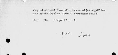 //// Jag minns ett land där tysta stjemeqvällen //// den mörka himlen klär i norrskensprakt. //// 4:8 BO. Brage 12 nr 2. //// . ////