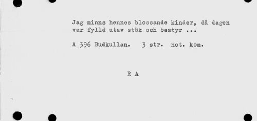 //// Jag minns hennes blossande kinder, då dagen //// var fylld utav stök och bestyr ... //// A 396 Budkullan. 3 str. not. kom. //// ! R A ////