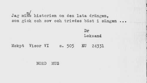 //// n/ //// Jag min4 historien om den lata drängen, //// som gick och sov och trivdes bäst i sängen ... //// Dr //// Leksand //// Mskpt Visor VI s. 505 EU 24331 //// NORD ms ////