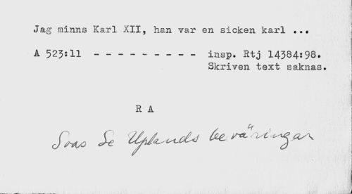 //// Jag minns Karl XII- han var en sicken karl ... i //// ! //// A 523:11 ----insp. Rtj 14334:98. //// Skriven text saknas. //// ' ' ,' i //// R A //// ! //// < //// < ////