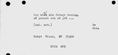 //// v //// Jag mins min faders boning, //// så gammal och så grå ... //// (mel. not.) Dr //// Boda //// Mskpt Visor, EU 35498 ////