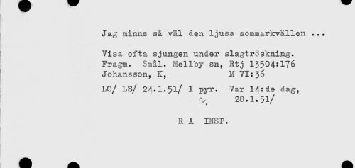 //// Jag minns s& väl den ljusa sommarkvällen ..* //// Visa ofta sjungen under slagtröskning. //// Fragm. Smal. Mellby sn, Rtj 13504:176 //// Johansson, K, M VI:36 //// LO/ LS/ 24.I.51/ I pyr. Var 14:de dag, //// ^ 28.1.51/ //// R A INSP. ////