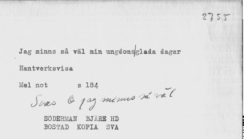 //// Jag minns så väl min ungdomsjglada dagar //// Hantverksvisa //// Hel not s 184 //// SÖDERMAN BJARE HD //// BOSTAD KOPIA SVA ^ ////