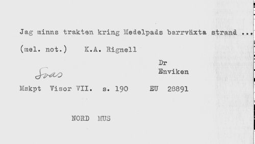 //// t //// Jag minns trakten kring Medelpads barrväxta strand //// (mel. not.) K.A. Rignell //// i //// Dr //// J Enviken //// Mskpt Visor VII. s. 190 EU 28891 ////