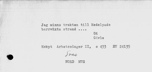 //// ! //// Ja,g minns trakten till Medelpads //// barrväxta strand .... //// Gä //// Gävle //// Hskpt Årbetssånger II, s 433 EU 24135 ////