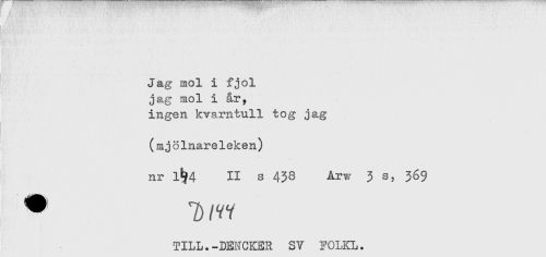 //// Jag mol i fjol //// jag mol i år, //// ingen kvarntull tog jag //// (mj 8Inareleken) //// nr 1^4 II s 433 Arw 3 s, 369 //// * T) /vv //// TILL.-DENCKER SV FOLKL. ////