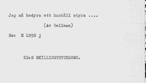 //// ] //// H //// H //// Jag må bedyra ett hushåll styra .... //// (Av Bellman) . //// H //// Se: E 1850 j : //// H //// ! //// KB:S SKILLINGTRYCKSREG. //// r ////