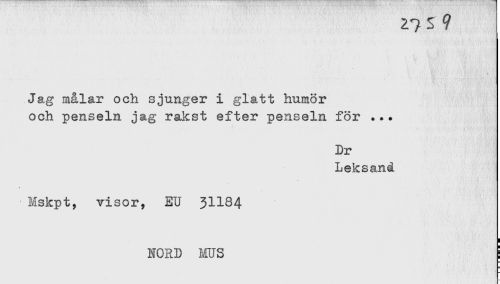 //// Jag målar och sjunger i glatt humor //// och penseln jag rakst efter penseln för ... //// Dr //// Leksand //// Mskpt, visor, EU 3II84 //// ! //// NORD MUS i ////