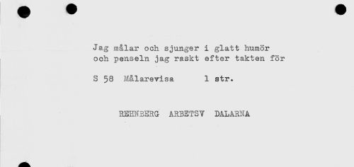 //// Jag målar och sjunger i glatt humor //// och penseln jag raskt efter takten for //// t //// S 58 Målarevisa 1 str. //// REENEERG ARBETSV DALARNA ////