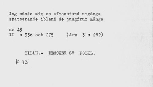 //// Jag månde mig en aftonstund utgånga //// spatseranRe ibland de jungfrur många //// nr 43 //// II s 336 och 275 (Arw 3 s 282) //// TILLH.- DENCKER SV FOLKL. ////