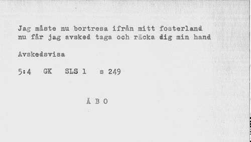 //// * ' ' < . //// Jag måste nu bortresa ifrån mitt fosterland //// nu får jag avsked taga och räcka dig min hand //// Avskedsvisa //// 5:4 GK SLS 1 s 249 //// ÅBO //// < //// a ////