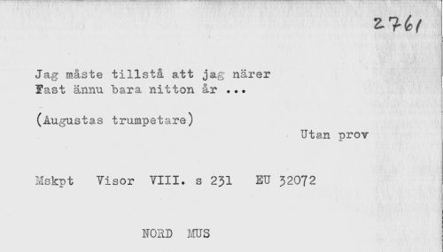 //// Jag måste tillstå att jag närer //// Fast ännu bara nitton år ... //// (Augustas trumpetare) //// - Utan prov //// Mskpt Visor VIII. s 231 EU 32072 //// NORD nus ////