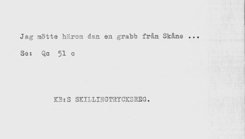 //// Jag mötte härom dan en grabb från Skåne ... //// Se: Qc 51 c //// it ' ? //// KB:S SKILLINGTRYCKSREG. //// t //// * .... ////
