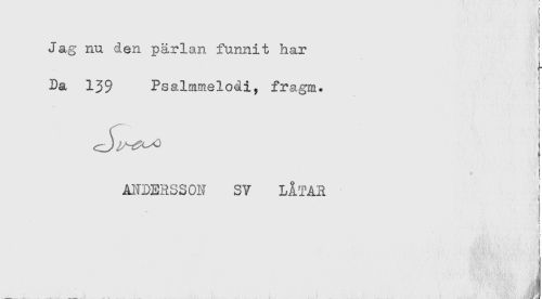 //// Jag nu den pärlan funnit har //// Da 139 Psalmmelodi, fragm. //// . 1 //// t //// ANDERSSON SV LÅTAR //// 1' //// ! //// ! //// << ////