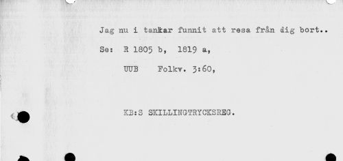 //// Jag nu i tankar funnit att resa från dig bort.. //// Se: 3 1805 b, 1819 a, //// UUB Folkv. 3:60, //// \ ' //// t //// \ //// i //// ^ . //// ^ KB:S SKILLINGTRYCKSREG. ////
