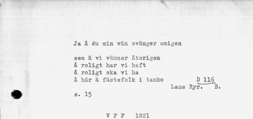 //// s . Ä //// Ja å åu min vän svänger omigen //// , . . . ' //// sen ä vi vänner återigen //// å roligt ha,r vi haft //// å roligt ska vi ha //// å här ä fästefolk i tanko D 116_ //// ^^ Lane Ryr.* B. //// V F F 1821 ////