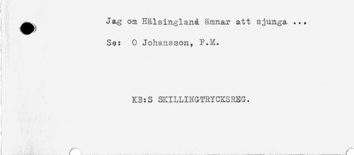 //// ) //// ^^ Jag om Hälsingland ämnar att sjunga ... //// i Se: 0 Johansson, P.M. //// i //// i //// KB:S SKILLINGTRYCKSREG. //// j //// < //// < //// r^ _..... .........._.............r ////