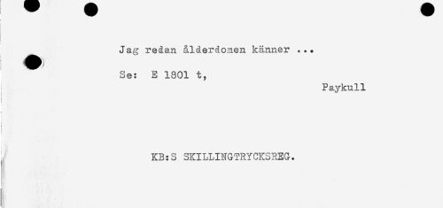 //// Jag redan ålderdomen känner ... //// Se: E 1801 t, //// Paykull //// ! ' //// ! //// t M //// KB:S SKILLINGTRYCKSREG. //// ; ////