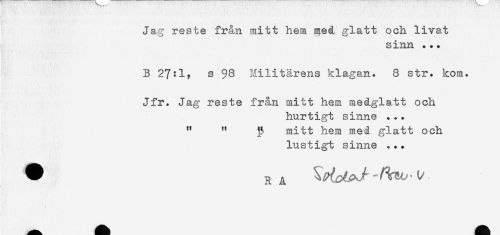 //// Jag reste frå,n mitt hem med glatt och livat //// sinn ... //// B 27:1? s 98 Militärens klagan. 8 str. kom. //// Jfr. Jag reste från mitt hem medglatt och //// hurtigt sinne ... //// " " § mitt hem med glatt och //// lustigt sinne ... ////