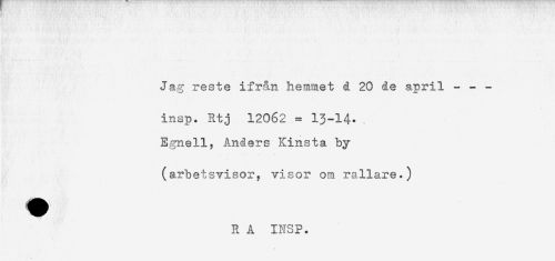 //// Jag reste ifrån hemmet d 20 de april - - - //// insp. Rtj 12062 = 13-14* //// Egnell, Anders Kinsta by //// (arbetsvisory visor om rallare.) //// R A INSP. ////