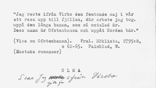 //// "Jag reste ifrån Yirbo den femtonde maj i vår //// att resa upp till fjällen, där arbete jag tog. //// uppå den långa banan, som så omtalad är. //// Dess namn är Ofotenbanan och uppåt Norden bär." //// (Visa om Ofotenbanan). Vrml. Möklinta, 2795:8, //// s 62-65. Palmblad, //// (Enstaka romanser) ////