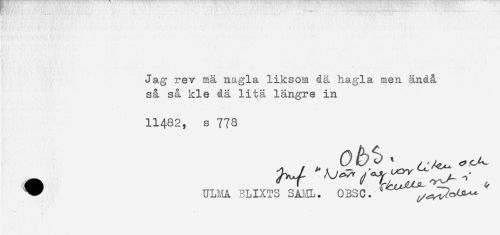 //// Jag rev mä nagla liksom dä hagla men ändå //// så så kle dä litä längre in //// 11482, s 778 //// ^ v , //// ^ ULMA BLIXTS SAI-IL. OBSC. ^ ////
