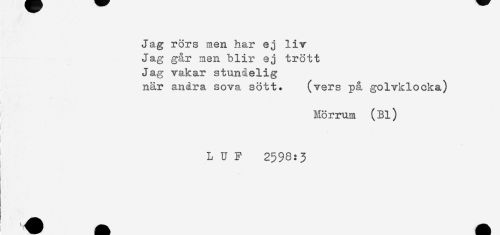 //// Jag rörs men har ej liv //// Jag går men blir ej trött //// Jag vakar stunåelig //// när andra sova sött. (vers på golvklocka) //// i .' //// Mö rrum (Bl) //// t //// L U F 2598:3 ////