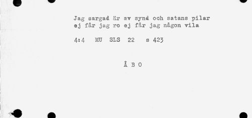 //// Jag sargad är av synd och satans pilar //// ej f&r jag ro ej får jag någon vila //// 4:4 MU SLS 22 s 423 //// ÅBO ////