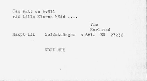 //// Jag satt en kväll //// vid lilla Klaras bädd .... //// Vrm //// Karlstad //// Mskpt 111 Soldatsånger s 661. EU 27232 //// NORD ms //// A- J ////