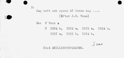 //// Jag s a 11 () ch spann cLå händ e si g . . . . //// (Efter J.H. Voss) //// Se: F Voss a //// N 1804 b, 1822 e, 1829 a, 1S34 u, //// 1837 a, 1855 b, I864 b, //// , KB:S SKILUNGTRYCKSREG. //// t ////