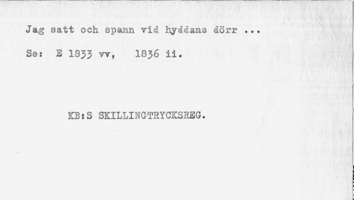 //// Ja.g satt och spann viå hyddans dörr ... //// Se: E 1833 v?, I836 ii. //// KB:S SKILLINGTRYCKSREG. //// ) ////