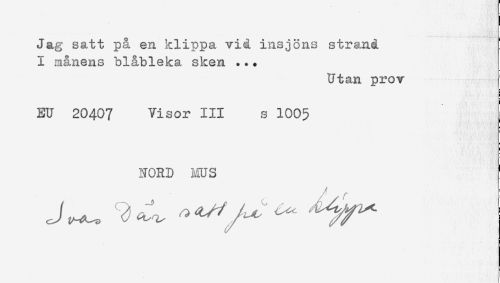//// Jag satt på en klippa vid insjöns strand //// I månens blåbleka sken ... //// Utan prov //// EU 20407 Visor III s 1005 //// NORD MUS //// * ////