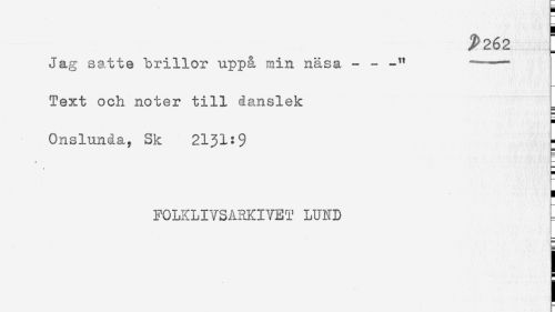 //// P262 ] //// Jag satte hrillor uppå min näsa - - '- //// Text och noter till danslek //// B //// Onslnnda, Sk 2131:9 //// ' — //// ) //// FOLXLITSARKI^fET LUND ^ ////