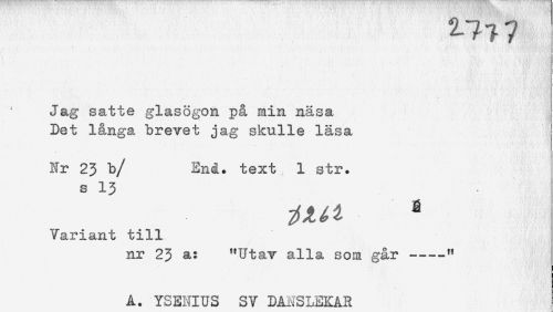 //// 2-77? //// Jäg satte glasögon på min näsa //// Det långa brevet jag skulle läsa //// Nr 23 b/ Enå. text 1 str. //// s 13 //// a //// Variant till //// nr 23 a: "Utav alla som går —-—" //// Å. YSENIUS SV DANSLEKAR ////