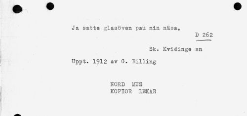 //// Ja satte glasöven pau min näsa, //// D 262 //// Sk. Kviåinge sn //// i Uppt. 1912 av G. Billing //// NORD ms //// KOPIOR LEKAR //// ' ' ////