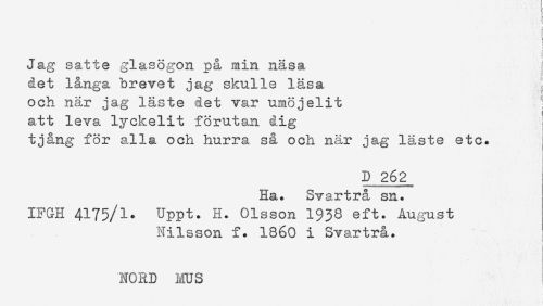 //// f //// [ //// Jag satte glasögon på min näsa //// det långa brevet jag skulle läsa //// och när jag läste det var umöjelit i //// att leva lyckelit förutan dig //// tjång för alla och hurra så och när jag läste etc. //// D 262_ //// Ha. Svartrå sn. //// IFGH 4175/1. Uppt* H. Olsson 1938 eft. August //// Nilsson f. 1860 i Svartrå. //// j //// NORD MUS ////