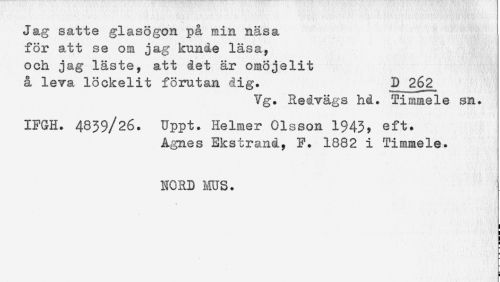 //// Jag satte glasögon på min näsa //// för att se om jag kunde läsa, //// och jag läste, att det är omöjelit //// å leva löckelit förutan dig. D 262 //// Vg. Redvägs hd. Timmele sn. //// IFGH. 4839/26. Uppt. Helmer Olsson 1943? eft. //// Agnes Ekstrand, F. 1882 i Timmele. //// NORD ms. //// ! //// i ////