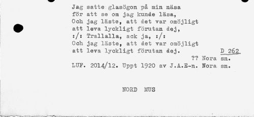 //// jag saLue giasogon pa mm nasa //// för att se om jag kunde läsa, //// Och jag läste, att det var omöjligt //// ^^ att leva lyckligt förutan dej, //// :/: Trallalla, ack ja, :/: //// Och jag läste, att det var omöjligt //// att leva lyckligt förutan dej. D 262, //// ?? Nora sn. //// LUF. 2014/12. Uppt 1920 av J.A.E-n. Nora sn. //// NORD MUS //// < ////