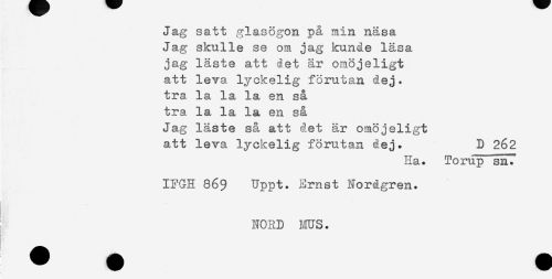 //// Jag satt glasögon på min näsa //// Jag skulle se om jag kunde läsa //// jag läste att det är omöjeligt //// att leva lyckelig förutan dej. //// tra la la la en så //// tra la la la en så //// Jag läste så att det är omöjeligt //// att leva lyckelig förutan dej. D 262 //// Ha. Torup sn. //// IFGH 869 Uppt. Ernst Nordgren. //// : NORD MUS. ////