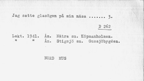 //// Jag satte glasögon på min näsa ....... 3. //// D 26^ //// Lekt. 1$41- An. Nätra sn. Köpmanholmen. //// " " Ån. Stigsjö sn. Gussjöbygåen. //// NORD ms ////