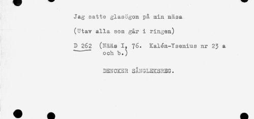//// Jag satte glasögon på min näsa //// (Utav alla som går i ringen) //// D 262 (Nääs I, 76. Kalén-Ysenius nr 23 a //// och b.) //// DENCKE3 SÅHGLEKSREG. //// * ////
